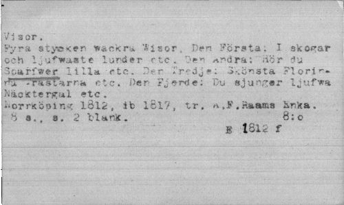 //// V i s or » //// Pyra stya<er vackra '-Visor, Den Första, I skogar och ljuf"wa«te lunder etc. Den Andra; 'iiör du 3carf»er l.illa -etc. D<?n Tredje; .»-.onsta Flori^--'ra %1'h rr.a c t c. De n F j *rd e; Du 8 j u ng« r 1 j uf'va häcktergal etc. //// Norrköping 1812, ib iBi?, tr. *»>'«H»aas inka, H s.„ a. 2 "blank. 8: o //// B 1812 f ////