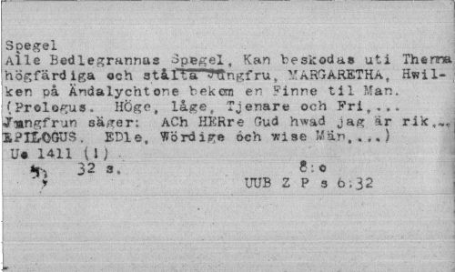 //// Spegel //// Alle B ed le granna s Spegel, Kan beskodas uti Thenna högfärdiga och stifta Sftngfru, MARGARETHA, Hwil-ken på Ändalychtone bekom en Finne til Man. (Prologus, Höge, låge, Tjenare och Fri,... Jungfrun sä^er; ACh HERre Gud hwad jag ar rik,,.. SPr&OGUS. EDIe, Word ige 6ch 7?ise Män,..,) Ue 1411 (1 ) . //// ^ 32 s. 8: o //// ' y UUB Z P 3 o,32 ////