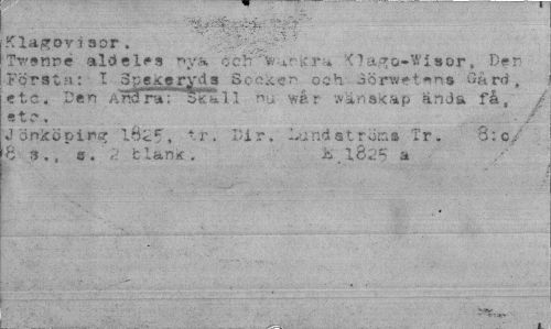 //// -.-•v. ••. ^ //// Klagovisor. //// IVenré aldeles nya och' <7a.go-Wisor, Den //// "Första: I SpsKtryds Socken och Sörwetens Gård, //// etc. Den Andra: SKall nu wår Win skåp ända få . ? ^ ' //// V» V > . //// Jönköping 18*5. tr. Dir. Lundströms Tr. 3:c/ 6 a ., s. ?. fclank . & 1Ö25 a //// • >-->: ////