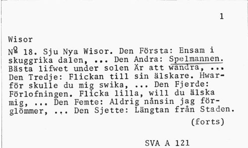 //// 1 //// Wisor //// N- 18. Sju Nya Wisor. Den Första: Ensam i skuggrika dalen, ... Den Andra: Spelmannen. Bästa lifwet under solen Är att wan^ra, ... Den Tredje: Flickan till sin älskare. Hwar-för skulle du mig swika, ... Den Fjerde: Förlofningen. Flicka lilla, will du älska mig, ... Den Femte: Aldrig nånsin jag förglömmer, ... Den Sjette: Längtan från Staden. //// (forts) //// SVA A 1?1 ////