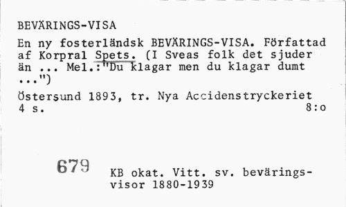 //// BEVÄRINGS-VISA //// En ny fosterländsk BEVÄRINGS-VISA. Författad af Korpral Spets. (I Sveas folk det sjuder än ... Mel.:"Du klagar men du klagar dumt //// "S //// • • • J //// Östersund 1893, tr. Nya Accidenstryckeriet 4 s. 8:0 //// 070 //// ' KB okat. Vitt. sv. bevärings-visor 1880-1939 ////