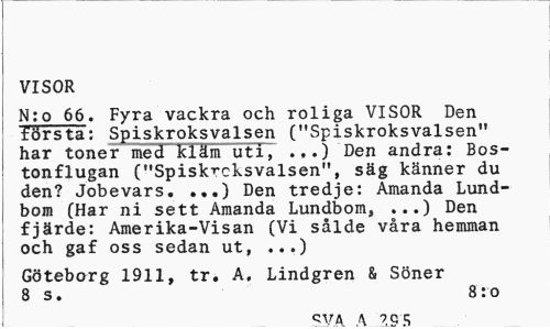 //// VISOR //// N:o 66. Fyra vackra och roliga VISOR Den första: Spiskroksvalsen ("Spiskroksvalsen" har toner med kläm uti, ...) Den andra: Bos-tonflugan ("Spiskrcksvalsen", säg känner du den? Jobevars. ...) Den tredje: Amanda Lundbom (Har ni sett Amanda Lundbom, ...) Den fjärde: Amerika-Visan (Vi sålde våra hemman och gaf oss sedan ut, ...) //// Göteborg 1911, tr. A. Lindgren & Söner 8 s. 8:o //// QVA A 9 OX ////