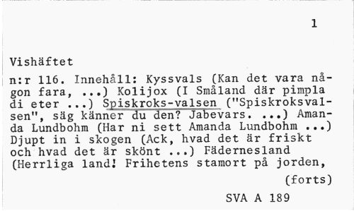 //// 1 //// Vishäftet //// ¦ //// n:r 116. Innehåll: Kyssvals (Kan det vara någon fara, ...) Kolijox (I Småland där pimpla di eter ...) Spiskroks-valsen ("Spiskroksval-sen", säg känner du den? Jabevars. ...) Amanda Lundbohm (Har ni sett Amanda Lundbohm ...) Djupt in i skogen (Ack, hvad det är friskt och hvad det är skönt ...) Fädernesland (Herrliga land.' Frihetens stamort på jorden, //// (forts) //// SVA A 189 ////