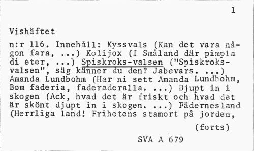 //// 1 //// Vishäftet //// n:r 116. Innehåll: Kyssvals (Kan det vara någon fara, ...) Kolijox (I Småland där pimpla di eter, ...) Spiskroks-valsen ("Spiskroksvalsen", säg känner du den? Jabevars. ...) Amanda Lundbohm (Har ni sett Amanda Lundbohm, Bom faderia, faderaderalla. ...) Djupt in i skogen (Ack, hvad det är friskt och hvad det är skönt djupt in i skogen. ...) Fädernesland (Herrliga land.' Frihetens stamort på jorden, //// (forts) //// SVA A 6 79 ////
