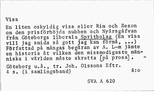 //// Visa //// En liten oskyldig visa eller Rim och Reson om den prisförhöjda nubben och Nyårsgåfvan från Göteborgs liberala Spritbolag (En visa vill jag smida så gott jag kan förmå, ,. ») Författad på mångas begäran av A. L-m jämte en historia åt vilken den missmodigaste människa i världen måste skratta [på prosa] . //// Göteborg u.å., tr. Joh. Olssons Eftr. 4 s. (i samlingsband) 8:0 //// SVA A 620 ////