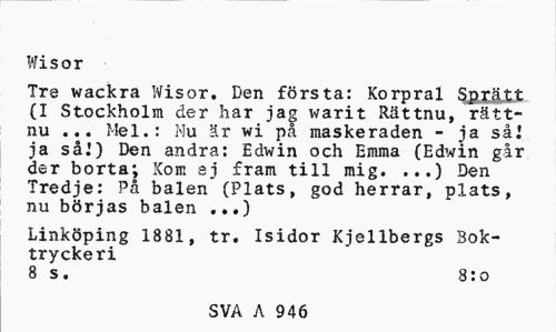 //// Wisor //// Tre wackra Wisor. Den första: Korpral Sp„£$L£t (I Stockholm der har jag x^arit Rättnu, rätt-nu ... Mel.: Nu är wi på maskeraden - ja sål ja så!) Den andra: Edwin och Emma (Edwin går der borta; Kom ej fram till mig. ...) Den Tredje: På balen (Plats, god herrar, plats, nu börjas balen //// Linköping 1881, tr. Isidor Kjellbergs Boktryckeri //// 8 s. 8:0 //// SVA A 946 ////