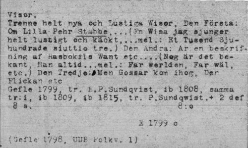 //// Visor f;" //// Trenne helt rya och Lustiga Wisor, Der? Företa; Om Lilla Pehr Stab be , . , , ( Fr- Wisa jag sjunger helt lustigt och käck t,...mel.: St Tusend Sjuhundrade siuttlo tre») Den Andra: Ar en beskrif-nin^ af Basbokils want etc..,.(Bag är det bekant, Man altid .. .mel.: Far werld en, Far wäl, etc») Den Xredj©;#Men Gossar kom ihog, Der Flickar etc //// Gefle 1799, tr. K.P.Sundqvist, it 1808, samma tr;i, ib 1809, ib l8l$( tr. P.Sundqwist 2 def 8 s. • 8:0 //// S 1799 c //// ( Gpfle' 1798, UUE Folk v . 1) ////