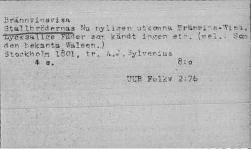 //// Brännvingvisa //// Stal 7. b röd p fras Nu ny lidren ut < om na Bränwi" //// ~Lye< 3 a lire ,^'uder sor. k and t insen et", (rr e 1.. San //// den bekanta Walsen.) //// 31 oekh o tr» 1801, t v» Syl v Iuå //// 4 3. 8;o //// UUB Folkv 2; 76 ////