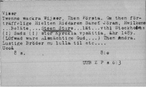 //// V i s »r //// Twenne wackra Wijser, Then Första. Q» then förträfflige Hielten Riddaren 3anct~ Jörars, Hvilkens . . .Beläte . ., SteenSture . . ,lät. .. vthi Stockholm s (I) Sadz (1) stor Syre k'i a vpsättla, åhr 1489. (LOfwad ware i^lsmächti ge Gud,...) Then Ändra. Lustige Bröder nu lulla til etc..,. Uooå //// 8 s, . 8;o //// TJUB Z ? s 6:3 ////