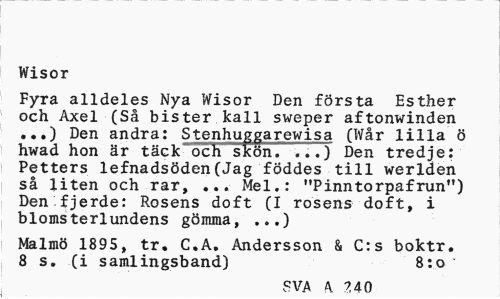 //// Wisor //// Fyra alldeles Nya Wisor Den första Esther och Axel (Så bister kall sweper aftonwinden ...) Den andra: Stenhuggarewisa (Wår lilla ö hwad hon är täck och ~stcön. ...) Den tredje: Petters lefnadsöden(Jag föddes till werlden så liten och rar, ... Mel.: "Pinntorpafrun") Den fjerde: Rosens doft (I rosens doft, i blomsterlundens gömma, ...) //// Malmö 1895, tr. C.A. Andersson & C:s boktr. 8 s. (i samlingsband) 8:0 " //// SVA A. 7,40 ////