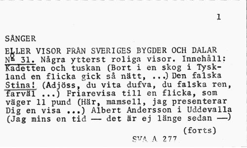 //// 1 //// SÅNGER //// ELLER VISOR FRÄN SVERIGES BYGDER OCH DALAR N- 31» Några ytterst roliga visor. Innehåll: Kadetten och tuskan (Bort i en skog i Tyskland en flicka gick så nätt, .,.) Den falska Stina! (Adjöss, du vita dufva, du falska ren, farväl ...) Friarevisa till en flicka, som väger 11 pund (Här, mamsell, jag presenterar Dig en visa ...) Albert Andersson i Uddevalla (Jag mins en tid — det är ej länge sedan —) //// (forts) //// SV\ A 277 ////