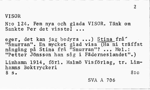//// 2 //// VISOR //// N:o 124. Fem nya och glada VISOR. Tänk om Sankte Per det visste! ... //// eger, det kan jag bedyra ...) Stina frk" "Snurran". En mycket glad visa (Ha ni träffat nångång på Stina frå "Snurran"? ... Mel.: "Petter Jönsson han såg i Fäderneslandet".) //// Limhamn 1914, förl. Malmö Vis förlag, tr. Limhamns Boktryckeri //// 8 s. 8: c //// SVA A 706 ////