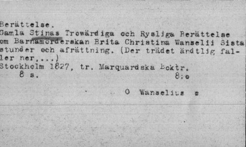 //// berättelse. //// Jamla Stinas Tro» ärd i ga och Rysliga Berättelse >m Barn^auTFäerskan Erita Christina V/anselii Sista stunder och afrättning. (Der trädet ärdtlig faller ner,...) //// Stockholm 182?, tr. Marquardska toktr. 8 s, 8; o //// 0 Wanseliue e ////