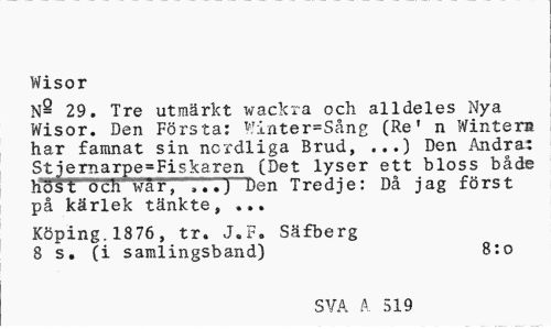 //// Wisor //// N- 29. Tre utmärkt wackra och alldeles Nya Wisor. Den Första: Winter=Sång (Re' n Wintera har famnat sin nordliga Brud, ...) Den Andra: Stjernarpe=Fiskaren (Det lyser ett bloss både liosf och war, Den Tredje: Då jag först //// på kärlek tänkte, ... //// Köping. 1876 , tr. J.F. Säfberg 8 s. (i samlingsband) 8:o //// SVA A 519 ////