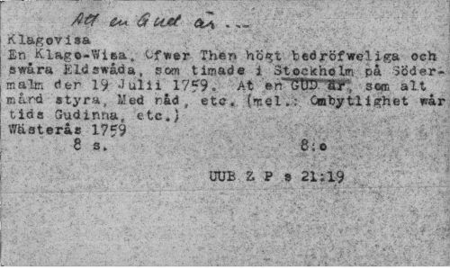 //// Att $ t*M ctA, . '^ä //// Klagovis» //// En Klago-Wisa, Cf*er Then hÖ<?t bedröfweliga och swåra Jiidswåda, som timade i Stockholm på Södermalm der 19 Juli i 17*9. At en '(J'UD AT, seni alt mård styra, Med nåd, etc. {mel.: Crobytlighet wår tids Gudinna, etc») Wästeras 1759 //// \ t «» fi» //// UUB Z P s 21;19 ////