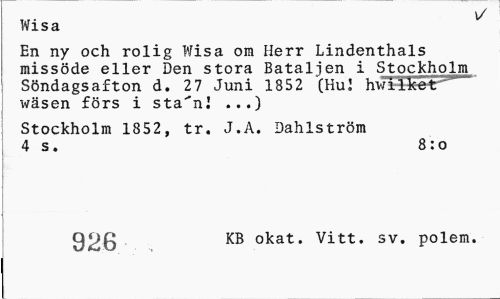 //// V //// Wisa //// En ny och rolig Wisa om Herr Lindenthals missöde eller Den stora Bataljen i Stockholm Söndagsafton d. 27 Juni 1852 (Hul hwilket wäsen förs i sta"*nj ...) //// Stockholm 1852, tr. J.A. Dahlström 4 s. 8:o //// 926 KB okat< vitt. sv. polem. ////