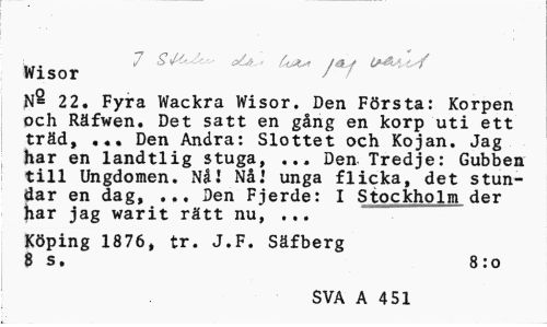 //// 7 S ol* t /<? v ¦: / Wisor / //// N^ 22. Fyra Wackra Wisor. Den Första: Korpen och Räfwen. Det satt en gång en korp uti ett träd, ... Den Andra: Slottet och Kojan. Jag har en landtlig stuga, ... Den Tredje: Gubben till Ungdomen. Nå! Nå! unga flicka, det stundar en dag, ... Den Fjerde: I Stockholm der har jag warit rätt nu, ... //// Köping 1876, tr. J.F. Säfberg //// 8 s. 8 :o //// SVA A 451 ////