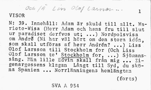 //// Oc-i.-, //? C o0*1 l - • i //// VISOR //// N: 39. Innehåll: Adam är skuld till allt. Wa-riete-Wisa (Herr Adam och hans fru till slut ur paradiset derfvos ut; ...) Nordpolsvisa om Andre (Ni har väl hört om den stora idén, som skall utföras af herr Andrén? ...) Liss Olof Larsson till Stockholm for (Och Liss Olof Larsson te' Stockholm for, ...) Sjömanssång. Min lille Edvin skall från mig ... Zi~ genargossens klagan Långt till Syd, du sköna Spanien ... Norrlänningens hemlängtan //// (forts) //// SVA A 954 ////