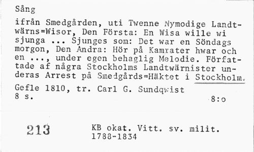 //// Sång //// ifrån Smedgården, uti Twenne Nymodige Landt-\rårns=Wisor, Den Första: En Wisa wille wi sjunga ... Sjunges som: Det war en Söndags morgon, Den Andra: Hör på Kamrater hwar och en ..., under egen behaglig Melodie. Författade af några Stockholms Landtwärnister un-deras Arrest på Smedgårds=Häktet i Stockholm, //// Gefle 1810, tr. Carl G. Sundqvist 8 s. 8:0 //// 9 1 Q KB okat. Vitt. sv. milit. //// 1788-1834 ////