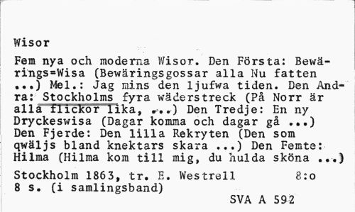 //// Wisor //// Fem nya och moderna Wisor. Den Första: Bewä-rings=Wisa (Bewäringsgossar alla Nu fatten ...) Mel.: Jag mins den ljufwa tiden. Den Andra: Stockholms fyra wäderstreck (På Norr är alla" tiicKor lika, .) Den Tredje: En ny Dryckeswisa (Dagar komma och dagar gå ...) Den Fjerde: Den lilla Rekryten (Den som qwäljs bland knektars skara ...) Den Femte: Hilma (Hilma kom till mig, du hulda sköna ...) //// Stockholm 1863, tr. E. Westrell 8:0 //// 8 s. (i samlingsband) //// SVA A 592 ////