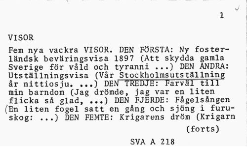 //// J //// 1 //// VISOR //// Fem nya vackra VISOR. DEN FÖRSTA: Ny fosterländsk beväringsvisa 189 7 (Att skydda gamla Sverige för våld och tyranni ...) DEN ANDRA: Utställningsvisa (Vår Stockholmsutställning år nittiosju. ...) DEN~"TREDJE: Farväl till min barndom (Jag drömde, jag var en liten flicka så glad, ...) DEN FJERDE: Fågelsången (En liten fogel satt en gång och sjöng i furuskog: ...) DEN FEMTE: Krigarens dröm (Krigarn //// (forts) //// SVA A 218 ////