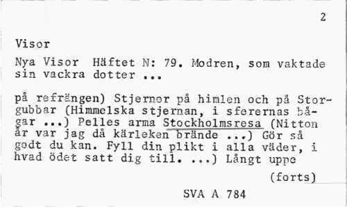 //// 2 //// Visor //// Nya Visor Häftet N: 79. Modren, som vaktade sin vackra dotter ... //// på refrängen) Stjernor på himlen och på Storgubbar (Himmelska stjernan, i sferernas bågar ...) Pelles arma Stockholmsresa (Nitton ar var jag då kärleken brände 777) Gör så godt du kan. Fyll din plikt i alla väder, i hvad ödet satt dig till. ...) Långt uppe //// (forts) //// SVA A 784 ////