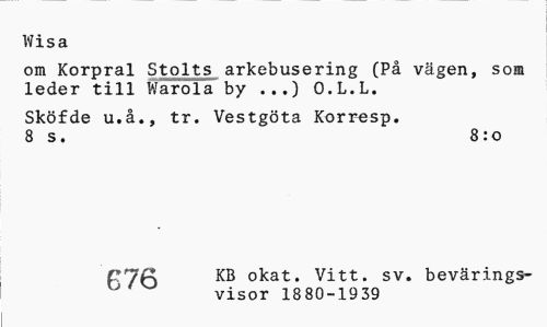 //// Wisa //// om Korpral Stolts arkebusering (På vägen, som leder till Warola by ...) O.L.L. //// Sköfde u.å., tr. Vestgöta Korresp. 8 s. 8:0 //// P7A KB okat. Vitt. sv. bevärings- //// u visor 1880-1939 ////
