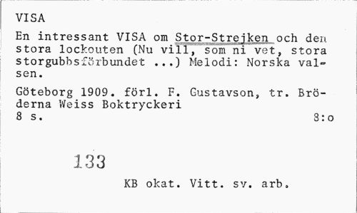 //// VISA //// En intressant VISA om Stor-Strejken och den stora lockouten (Nu vill, som ni vet, stora storgubbsförbundet ...) Melodi: Norska valsen. //// Göteborg 1909. förl. F. Gustavson, tr. Bröderna Weiss Boktryckeri //// 8 s. 8:0 //// 133 //// KB okat. Vitt. sv. arb, ////