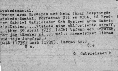 //// Av sk ed »»san tal. //// Twenne arma Syndares med heta tårar besprängde Af sk ed s-Sam tal, Författat Uti en WISA, T)å Brödren Gabriel Gabrielsson Och Systren Anna Gabri-els-Better, .. .vtstodo sine wälförtiente straff, ...then 30 April 173?. (AChl bäfwan och ängslad, när jag täncker på,... mel.; Himmelriket liknas wid tijo Jungfrur.) //// Uooå (173*1 uoeå (1735), (annat tr.) -8a. 8;a //// 0 Gabrielsaan b ////