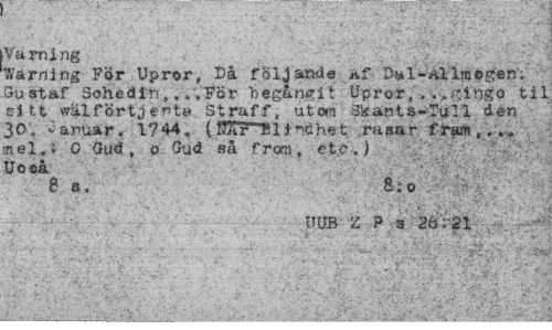 //// Varning //// Warning För Upror, Då följande Af Bal-Al lin ©gen V Gustaf Sohedin,..,För begångit Upror/. .»(*ingo til sitt wälf ö.rtj en t» Straff, utom Sk&nts-TuTl den 30 , 2anuar. 1744. (IVAr »1 J-ndh«st- rasar f r$m ,. si el, i O Gud , o Gud så f rem , etc.) ,: ' //// Uooå:, //// 8a, 8:0 //// tim z p 3 26V21 ¦^ //// _ . ¦ - . » ' , v V ¦ i , ^'; : t'.. //// «—läiä&ä»—a—• - ; __fa^___fe - ' . -' S&äs e ; -1 1. , | i il SS ////