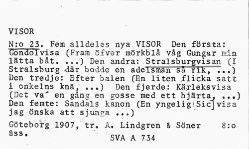 //// VISOR //// N:o 23. Fem alldeles nya VISOR Den första: Gondolvisa (Fram öfver mörkblå våg Gungar mim lätta båt. ...) Den andra: Stralsburgvisan (I Stralsburg där bodde en adelsman så rik, T..) Den tredje: Efter balen (En liten flicka satt i onkelns knä, ...) Den fjerde: Kärleksvisa (Det va" en gång en gosse med ett hjärta, ...) Den femte: Sandals kanon (En yngelig i Si c] visa jag önska att sjunga ...) //// Göteborg 1907, tr. A. Lindgren & Söner 8:0 8ss* SVA A 734 ////