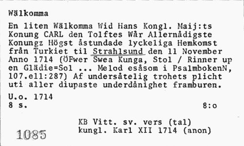 //// Wälkomma //// En liten Wälkomma Wid Hans Kongl. Maijits Konung CARL den Tolftes Wår Allernådigste Konungz Högst åstundade lyckeliga Hemkomst från Turkiet til Strahlsund den 11 November Anno 1714 (ÖFwer Swea Kunga, Stol / Rinner up en Glädie=Sol ... Melod esåsom i PsalmbokenN, 107.ell:287) Af undersåtelig trohets plicht uti aller diupaste underdånighet framburen. //// U.o. 1714 //// 8 s. 8:o //// KB Vitt. sv. vers (tal) //// 1086 kungl. Karl XIX 1714 (anon) ////