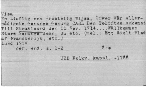 //// Visa //// En Liuflig och ^röstelig Wijsa, Ofwer Wår Aller-nådiarste honungs &onung CARL Ben Talfftes Anksmat Till Strahlsund den 11 1714...Wällkamman //// Store KanuWffS Sohn, du etc, (mel Ett ädelt Blad af Franckerijk, etc,) Lund 171* //// def. »nd, 3. 1-2 8 ' • //// UUB Poikv, kapsl. -1786 ////