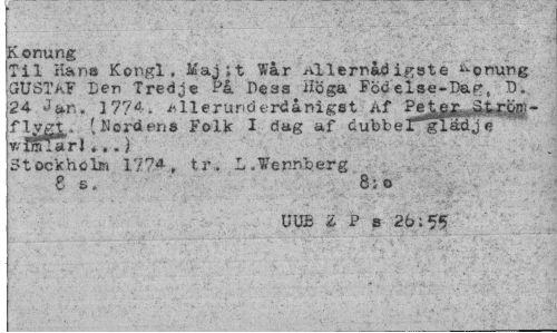 //// Konung //// Til Hans Kongl. Maj ;t War Atlernådigste honung GUSTAF Len Tredje På Dess Höga Födelse-Bag, B. 24 Jan. 3 774. Allerttnderdånigst Af Pe^&.jj.zM-fly&X ? 1 Nord ens Folk I dag af dubbe Jr gläd j e wfmfari. .. | //// Stockho1m 1774, tr. L.Wennberg //// 8 s, 8; o //// UUB ii P s 26:55 ////