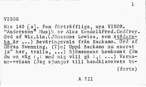 //// 1 //// VISOR //// N:o 140 [al. Fem förträffliga, nya VISOR. "Andersson" Musik av Alce Kendel&Fred.Codfrey. Ord af Wic.Lin.(Jönssons Lowisa, som städers-ka är ...) Beväringsvals från Backamo. Ord af Göran Svenning. (TjoJ Uppå Backamo nu exerat ja"* har, tralla, ...) Sjömannens hemkomst (Om du en väg :,: med mig vill gå :,: ...) Verna-mc-=visan (Jag sjunger till handklaverets to- //// (forts) //// A 722 ////