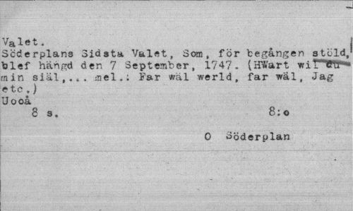//// Valet. //// Scderplana Sidata Valet, Som, för begången stöld, blef hängd den 7 September, 1747. (HWart viVTrr-nin siäl,.». mel.: Far wäl werld, far wäl, Jag etc.) U o oå //// 8 3. 8:o //// 0 Söderplan ////