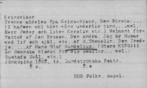 //// Krigsvisor //// Trenr.e aldeles Nya Kriss-Wisor, Den Första:.,, (I hafwen wäl hcrt mång underlig tir»,. . .mel. ' Herr Peder och liten Kerstin etc.) Welment författad af Jan Ersson» Den Andra Jan är Husar med lif och själ, etc. Af S.Themelir. Den Tredje: ...Af Hans 91of Sund el i ue.. (Stare KUNG Ml An Sv/enska ti odet för d. ig^swäTiar, ,. mel.; Gu s tafs Skil, etc.) //// Jönköping 1808, tr. Lundströmska Eoktr. 8 s. 8.0 //// UUB Folkv, ka.psl. ////