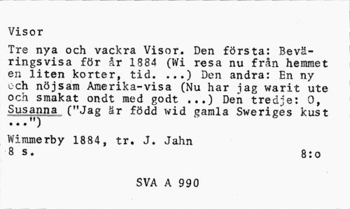 //// Visor //// Tre nya och vackra Visor. Den första: Bevä- //// ringsvisa för år 1884 (Wi resa nu från hemmet //// en liten korter, tid. ...) Den andra: En ny //// och nöjsam Amerika-visa (Nu har jag warit ute //// och smakat ondt med godt ...) Den tredje: 0, //// Susanna ("Jag är född wid gamla Swerigés kust i»-» ... ) //// Wimmerby 1884, tr. J. Jahn 8 s. 8:o //// SVA A 990 ////