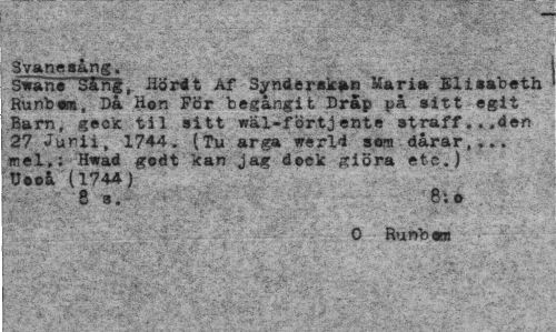 //// ;' ... , .^'--.^^'J-i'-;? 'i ¦::<:?¦ - //// --''-'v '-J - i!. ' - ' : ' . . ; v;> ^ ' . //// Svanesång. ' " v''"' .- //// siäne sång, Hördt Af Synderak*» Maria "Elisabeth Runb«®, Da H©n För begångit Dråp yå sitt egit Barn, geck til sitt wäl-förtjente straff...den 27 Jurii, 1744. (Tu arga werld som dårar,... mel.; Hwad godt kan jag doek giöra etc.) Uooå, (1744) //// 8 a. 8;o //// 0 Runbam //// : -fi' ' V-,-w --'..'v " •'''*"•'• •'.V; - •?•! ////