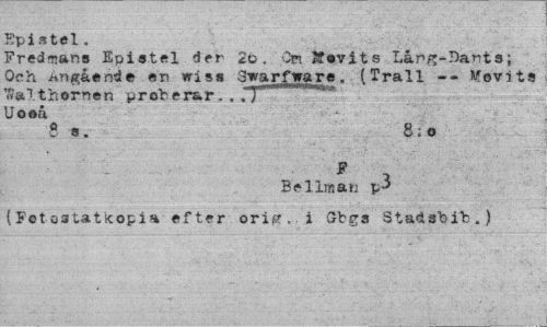 //// Epistel. //// Fredmans Epistel der 2o. OnJf svits Lång-Dants; Och angående en wisa Swarfware. (Trall -- Kfevits ^»Ithernen prober&r. . . Uooå //// 8 s. 8;o //// * , Bellman p-> //// (Fotoatatkopia efter orig.i Gbgs Stadsbit.) ////