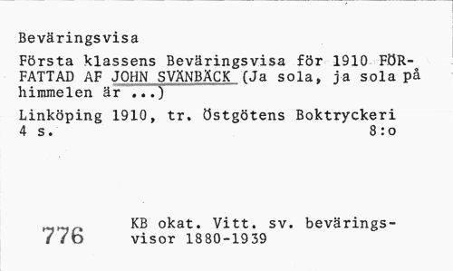 //// Beväringsvisa //// Första klassens Beväringsvisa för 1910 FÖRFATTAD AF JOHN SVÄNBÄCK (Ja Sola, ja sola på himmelen är ...) //// Linköping 1910, tr, östgötens Boktryckeri 4 s. 8 :o //// KB okat. Vitt. sv. bevärings-7 i b visor 1880-1939 ////