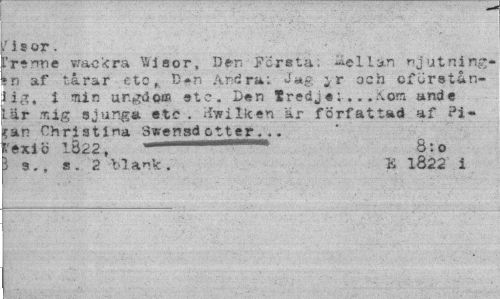 //// /is or. //// 1'renne wackra Wiaor, Dan Första: mellan njutning-*n af tårar etcDen Andra: Jag jr och ofUrstån-lig, i min ungdom etc. Den tredje.Kom ande Lär mig sjunga etc . iiwilken är författad af ?i-?an Christina Sweradetter... //// fc'exiö 1822, 8:0 //// i 3., a. 2 blark . K 1Ö22 i ////
