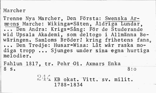 //// Marcher //// Trenne Nya Marcher, Den Första: Swenska Armeens Marche: Wikinga=Säten, Åldriga Lundar, .»»Den Andra: Krigs=Sång: För de Studerande wid Upsala Akademi, som deltogo i Allmänna Be-wäringen» Samloms Bröder.1 kring frihetens fana^ ... Den Tredje: Husar=Wisa-: Låt wår raska modiga tropp ... Sjunges under sina egna hurtiga melodier. //// Fahlun 1817, tr. Pehr 01. Axmars Enka 8 S. 8:o //// 44 KB okat. Vitt. sv. milit. 1788-1834 ////