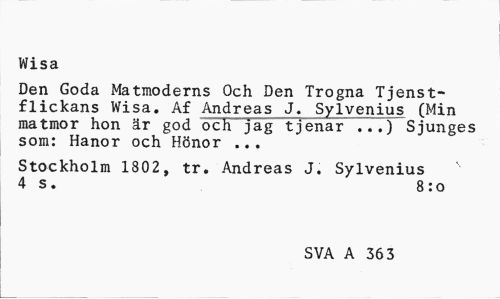 //// Wisa //// Den Goda Matmoderns Och Den Trogna Tjenst-flickans Wisa. Af Andreas J. Sylvenius (Min matmor hon är god och "jag tjenar ...) Sjunges som: Hanor och Hönor ... //// Stockholm 1802, tr. Andreas J. Sylvenius 4 s. 8:0 //// SVA A 363 ////