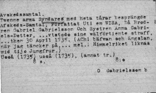 //// Av ak ed 8 samtal. //// Twenne arma Syndare* med heta tårar besprängde Af skeds-SamtaTT T^rfattat Uti en WISA, "Då Brödren Gabriel Gabrielsson Och Systren Anna Gabriels-Dotter, ,,.vtstode sine wälförtiente straff, ...then 30 April 173e. (AChl bäf?;an och ängslan, när jag täncker på,... mel.; Himmelriket liknas wid tijo Jungfrur.) Uooå (1735) uoeå (173?), (annat tr.) //// o a. 8;o //// 0 Gabrielsssn b ////