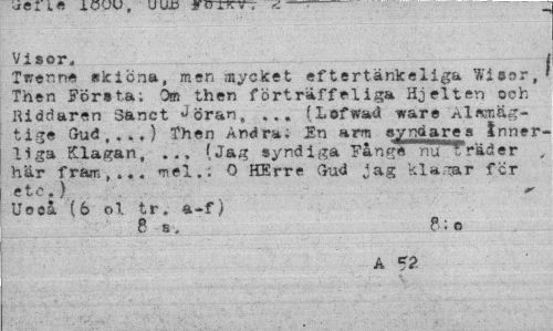 //// Visor, //// Twenne skicna, men mycket eftertänksliga Wisor, Then Första; Om then förträffeliga Hjelten och Riddaren 3anct Jöran, ,, (Lofwad ware Alsmäg-tige Gud , . »,} Then Andra. En arm syndare a Innerliga Klagan, ... (Jag syndiga Fån frenu"'vVäd e r , här fram,.., mel,; O HErre Gud jag kla -ar fcr etc.) ^ //// Uoaå (6 ol tr. a-f) //// 8 s, P ; o //// A ////