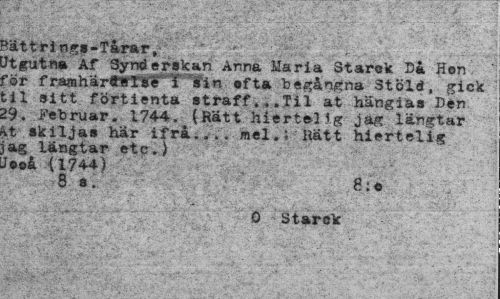 //// ^ättrin^s-Tårar • ' //// Jtgutna Af Synderskan Anna Maria Starok Då Hon rör framhärtrrtrr^fin ofta begångna Stöld, gick til sitt fortienta straff...Til at hängias Den 29. Februar. 1744. (Rätt hierteMg jag längtar fct skiljas här ifrå... mel.; Rätt hiertelig jag längtar etc.) Uooå {17 44) 8 s. //// 0 Starck ////