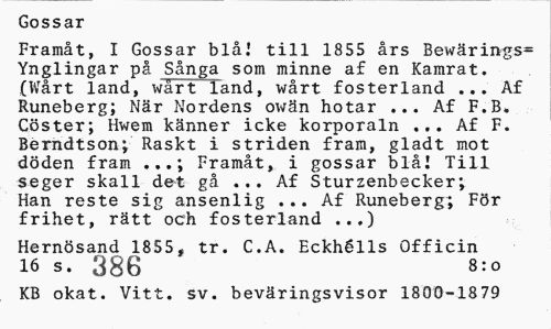 //// Gossar //// Framåt, I Gossar blå.' till 1855 års Bewärings= Ynglingar på Sånga som minne af en Kamrat. (Wårt land, wårt land, wårt fosterland ... Af Runeberg; När Nordens owän hotar ... Af F.B. Cöster; Hwem känner icke korporaln ... Af F. Berndtson; Raskt i striden fram, gladt mot döden fram Framåt, i gossar blå! Till //// seger skall det gå ... Af Sturzenbecker; Han reste sig ansenlig ... Af Runeberg; För frihet, rätt och fosterland ...) //// Hernösand 1855* tr. C.A. Eckhélls Officin 16 s. 386 8:o //// KB okat. Vitt. sv. beväringsvisor 1800-1879 ////
