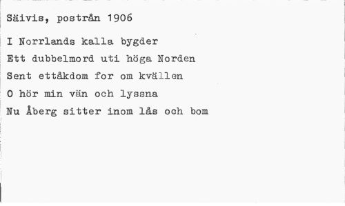 //// Säivis, posträn 1906 //// I Norrlands kalla bygder Ett dubbelmord uti höga lorden Sent ettåkdom for om kvällen 0 hör min vän och lyssna Nu Åberg sitter inom lås och bom ////