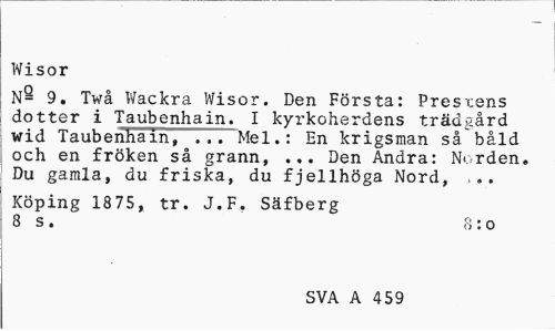 //// Wisor //// N- 9. Twå Wackra Wisor. Den Första: Prestens dotter i Taubenhain. I kyrkoherdens trädgård wid Taubenhain, ... Mel.: En krigsman så båld och en fröken så grann, ... Den Andra: Norden. Du gamla, du friska, du fjellhöga Nord, ,.. //// Köping 1875, tr. J.F. Säfberg 8 s . 8 : o //// SVA A 459 ////